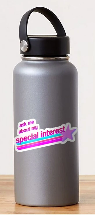 Invite others to ask you about your special interest with these colorful stickers! These water-resistant stickers are 4 x 1.1 inches and stick easily to surfaces like laptops and windows.