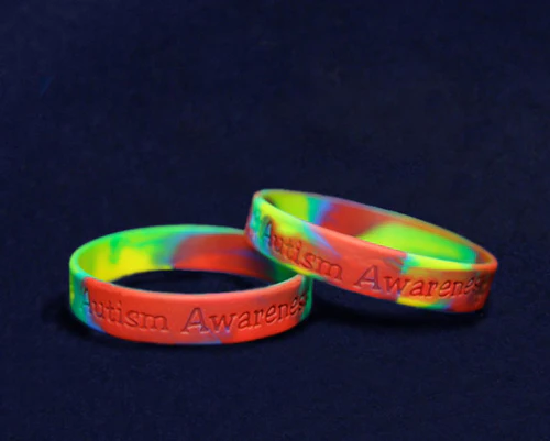 These rainbow Autism awareness gel bracelets are a hit! They are great for fundraisers or simply to show your support and raise awareness about Autism. These puzzle bracelets have indented “AUTISM AWARENESS” with puzzle pieces on a colorful gel bracelet.